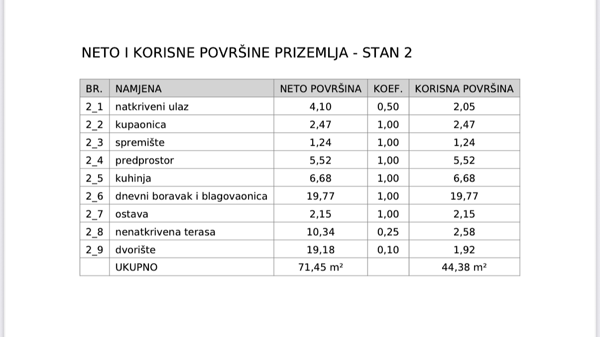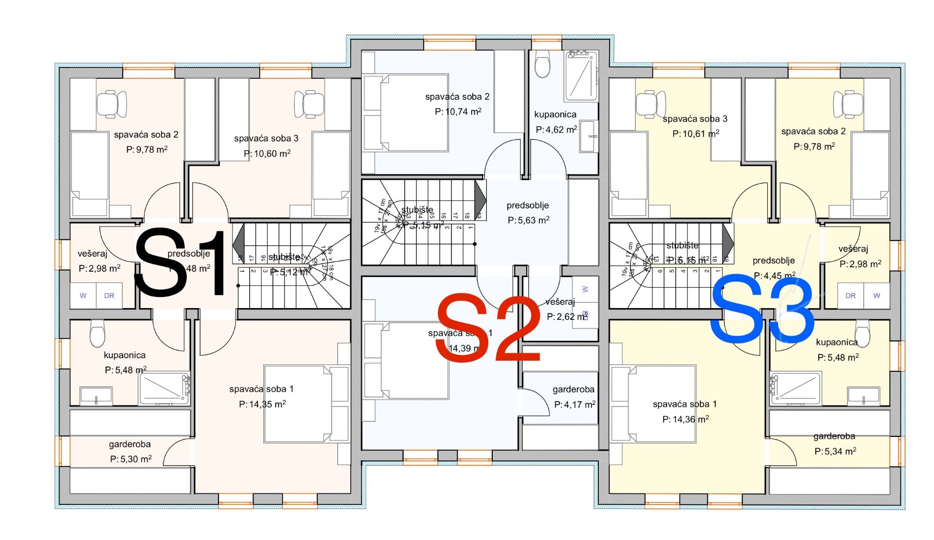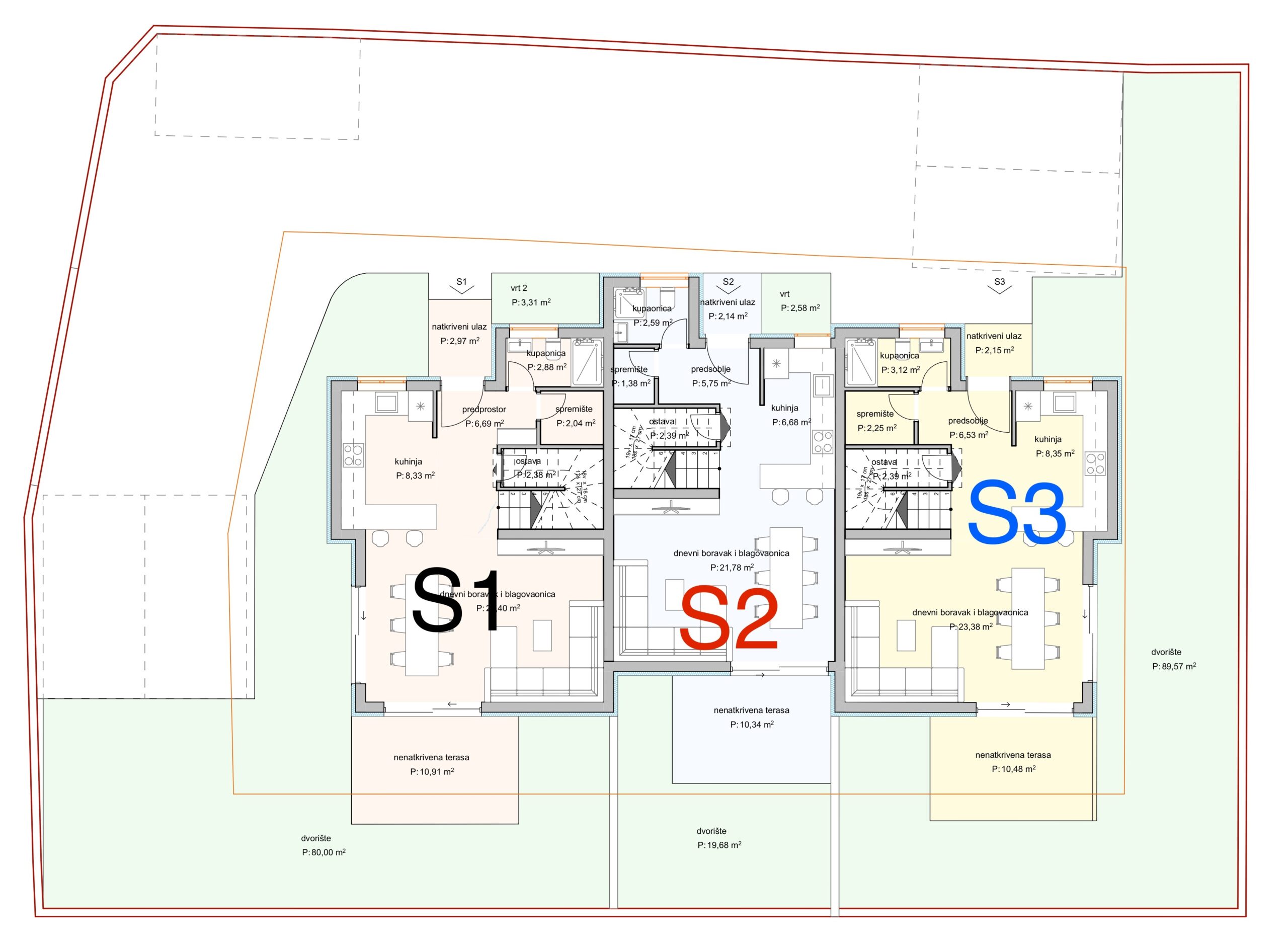 Kuća S2 dio je trojnog objekta i prostire se na prizemlje i prvi kat, s ukupnom korisnom površinom od 90,77 m². Pripada joj dvorište površine 19,18m², terasa od 10,34m² te jedno parkirno mjesto.