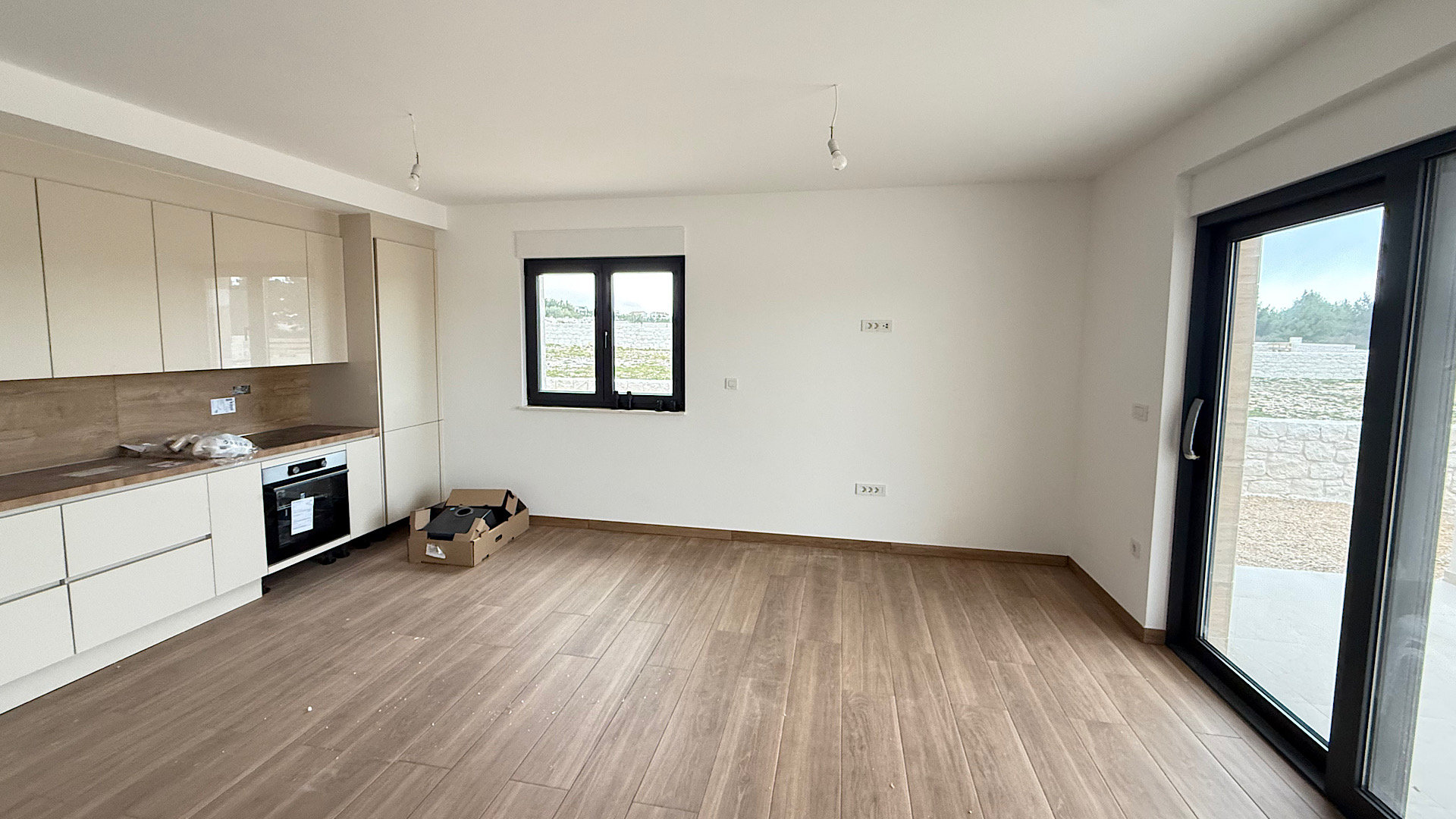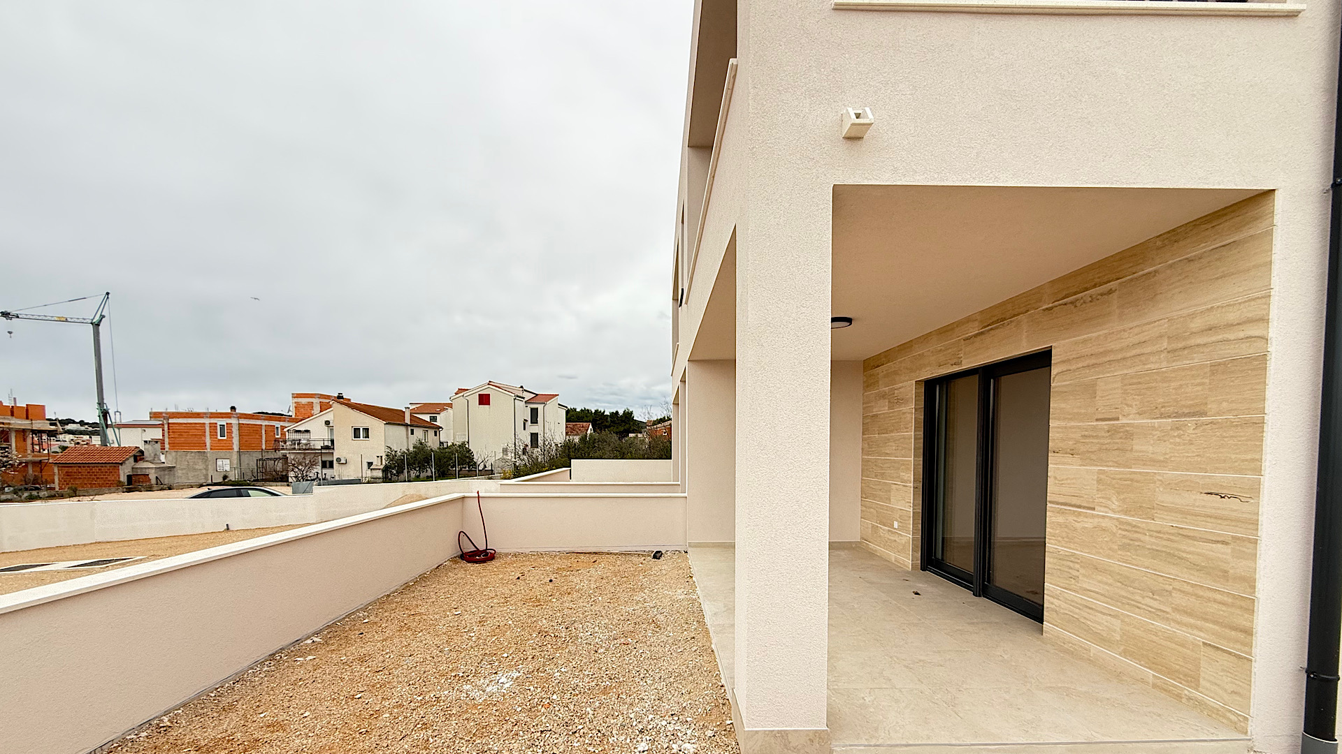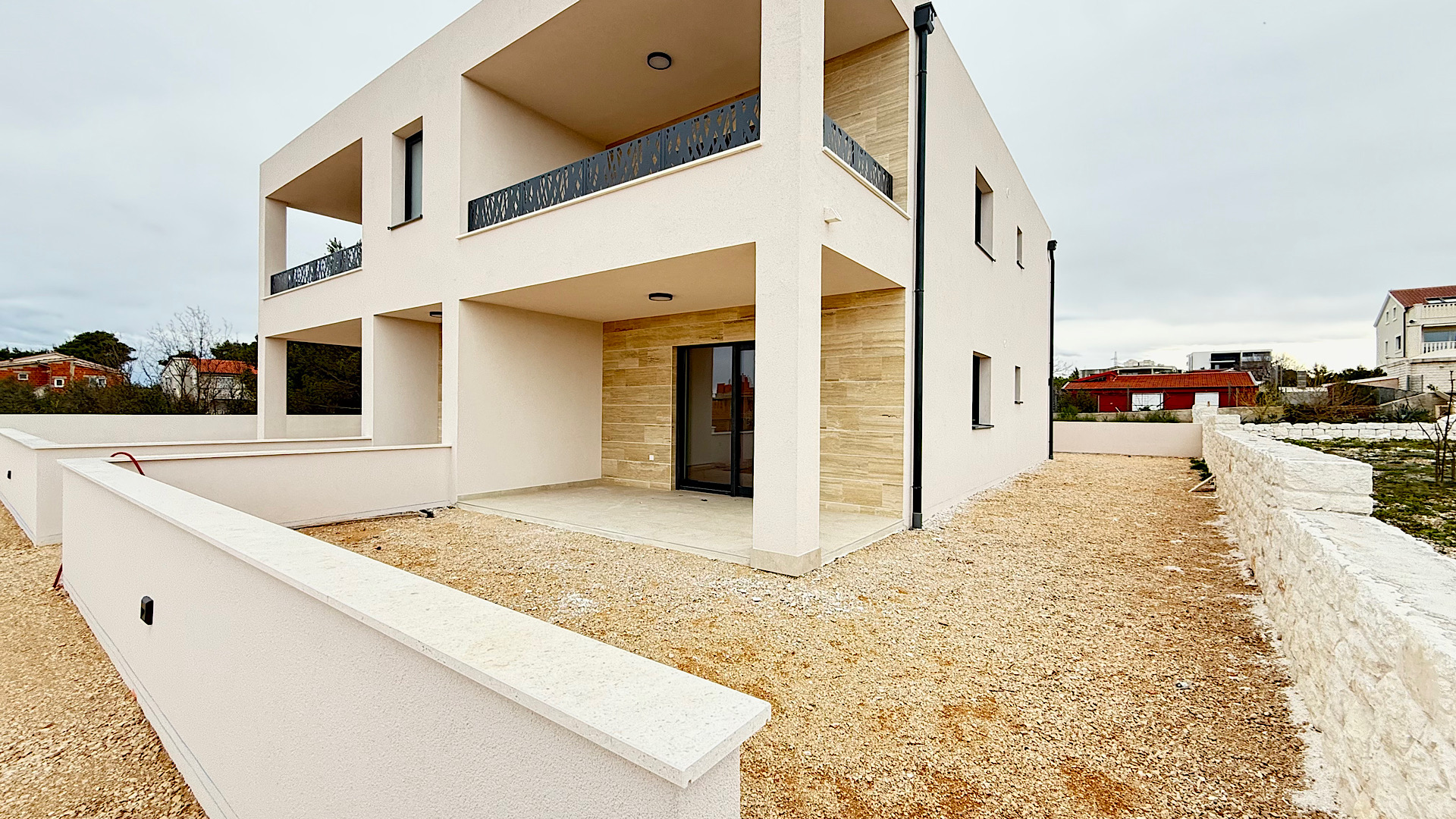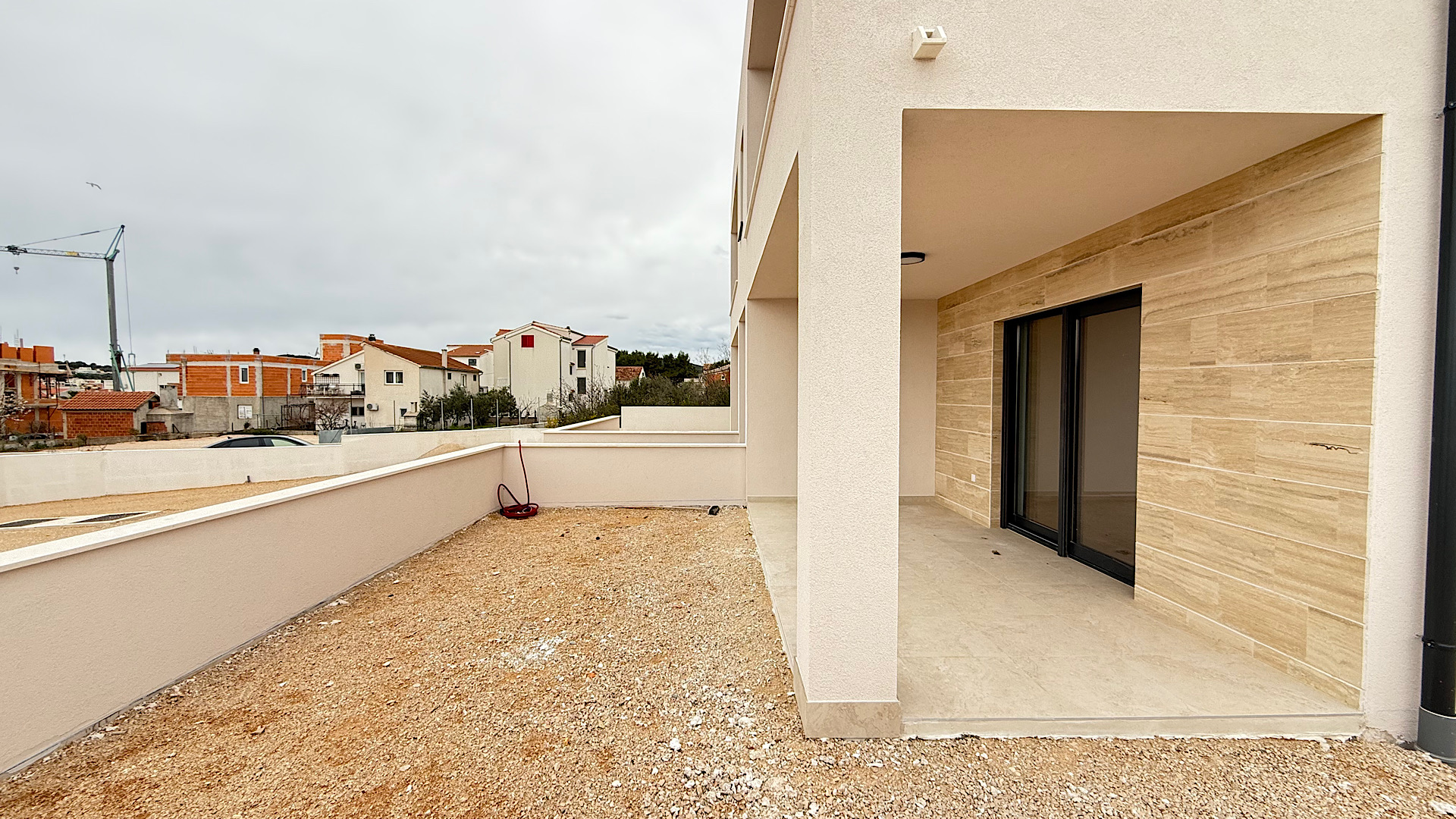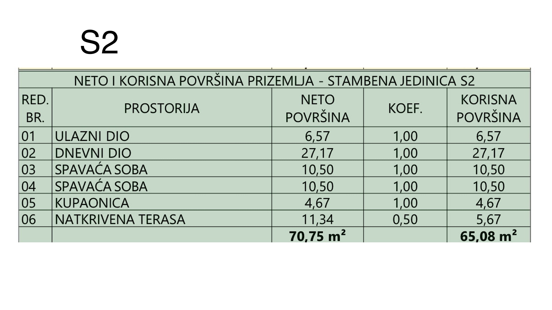 Stan ima ukupnu korisnu površinu 83m2 (s uračunatim koeficijentima), a sastoji se od ulaznog prostora, dnevnog dijela s izlazom na natkrivenu terasu, dviju spavaćih soba, kupaonice i pripadajuceg dvorišta i 2 parking mjesta.